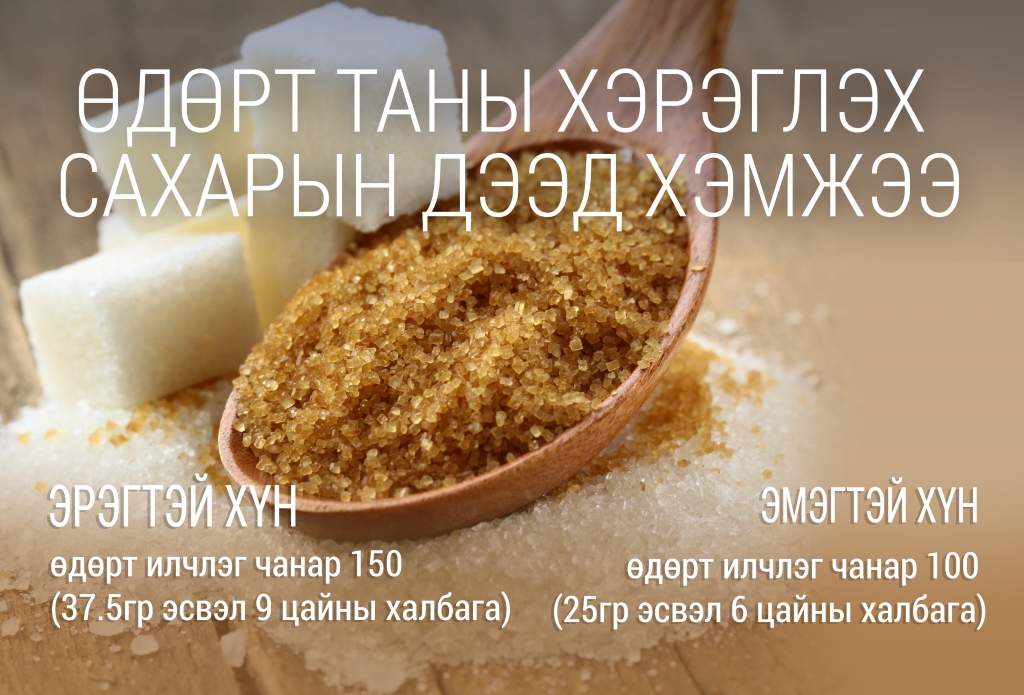 Нэг цайны халбага сахар нь ойролцоогоор 5гр буюу 20 калори агуулсан байдаг. Та аяга цайндаа 2 сахар хийж өдөрт хэдэн аягыг уухад таны хэрэглэсэн калорийн хэмжээ зөвхөн уусан цайныхаа хэмжээгээр хэтэрч эхэлнэ. Нэг лааз кока кола зөхөн сахарын орцоороо140 калори агуулсан байхад нэг ширхэг Snickers-ийн илчлэг чанар нь 120 калори байдаг. Танд л гэж хэлэхэд, хоол цайндаа зөвхөн амт нэмэхийн төлөө сахар нэмж хэрэглэхгүй байхаар бүрэн зохицуулж болно. Бие махбодид физиологийн чухал үүрэг ер гүйцэтгэдэггүй. Илүүдэл жинтэй хүмүүсийн идвэл зохих хоолны жагсаалтанд чихэрлэг ундаа, жигнэмэг, хагас боловсруулсан, түргэн хоол эзлэх байр байх ёсгүй. Аль болох цөөн орцтой, гэрээр бэлдсэн хоол хэрэглэж хагас боловсруулсан, бэлэн хоолноос зайлсхийгээрэй.